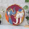 A beautiful pichwai artwork showcasing two majestic elephants with their trunks intertwined. The elephants stand on a wooden plate with a colorful floral border.
